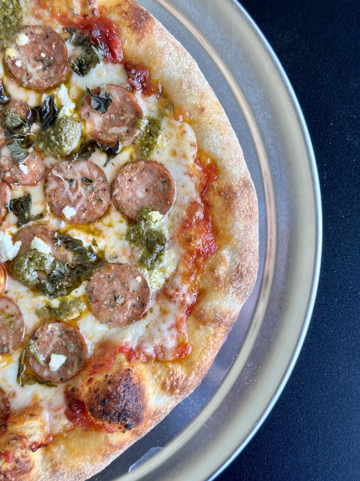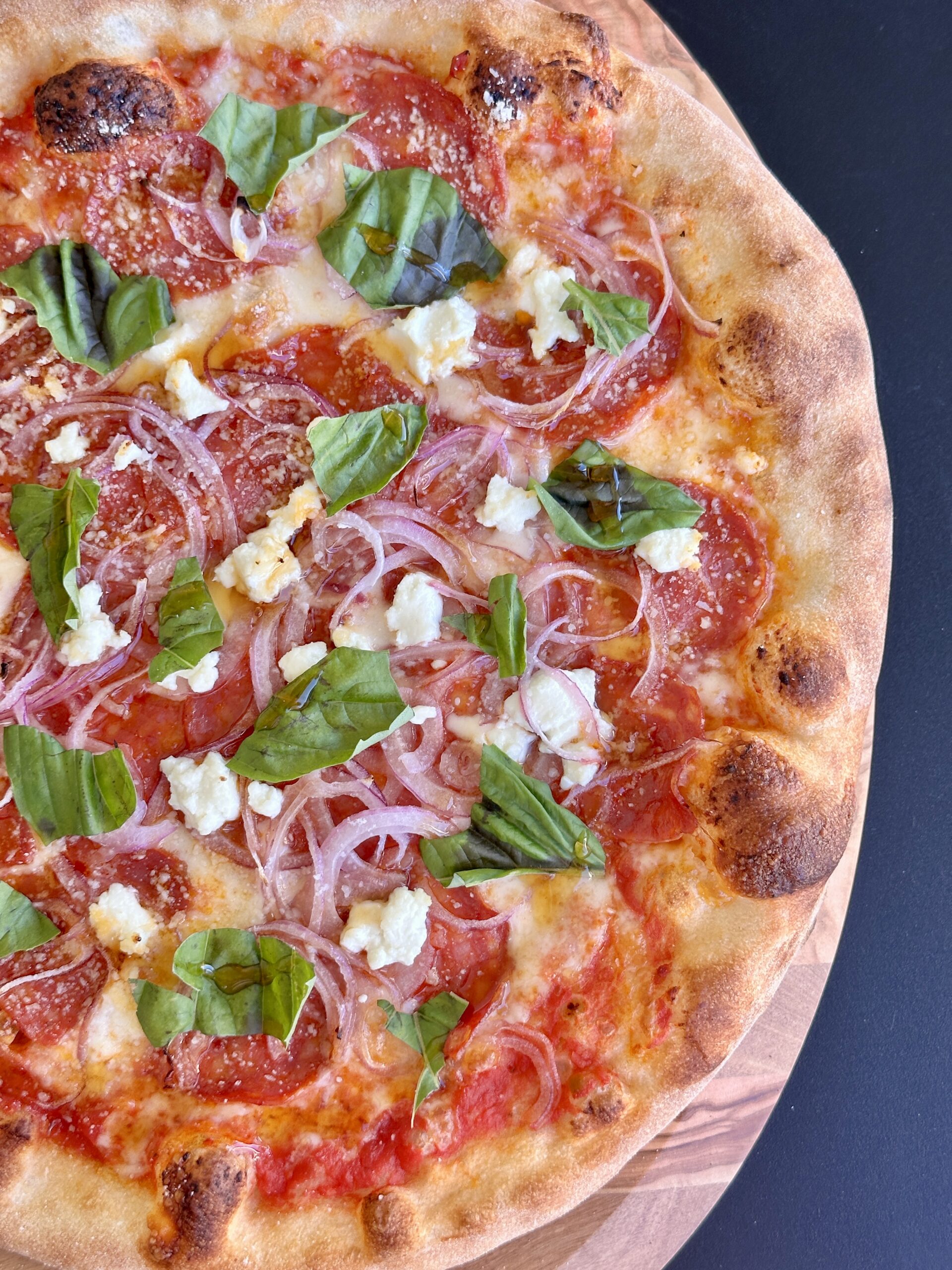Rosso calabrian chili base with mozzarella calabrese salami, goat cheese, red onions, basil, Mike’s hot honey drizzle