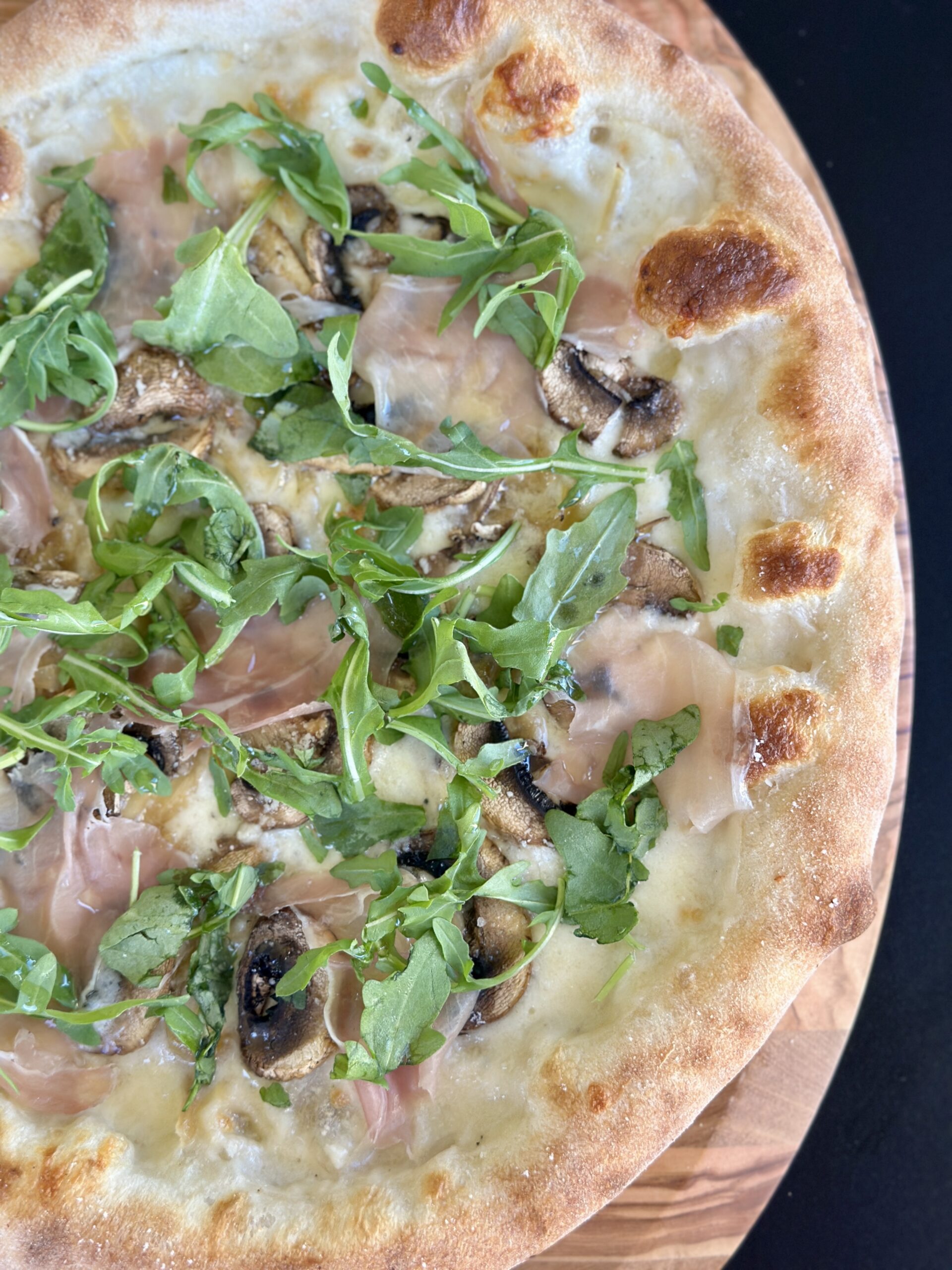 White garlic cream base with mozzarella mushrooms, caramelized onions, prosciutto, arugula